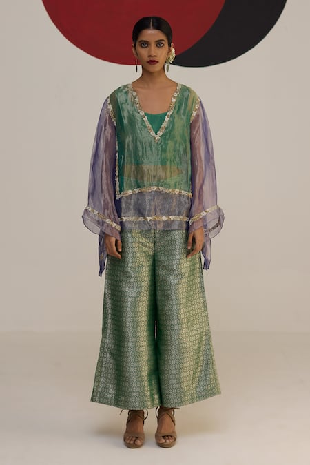 Green tissue kurta featuring embroidered panels and a V neckline. Paired with coordinating pants and an inner layer.