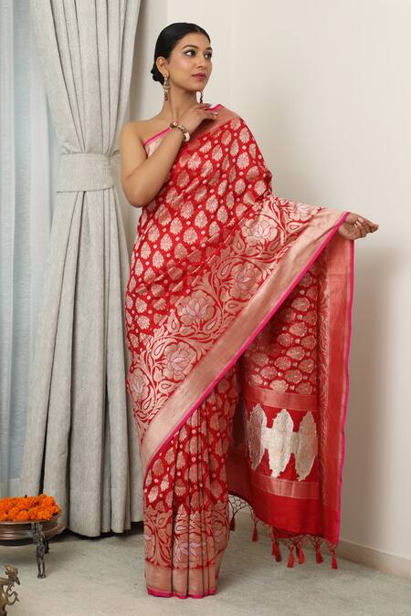 Red Silk Zari Padma Woven Floral Butti Banarasi Saree