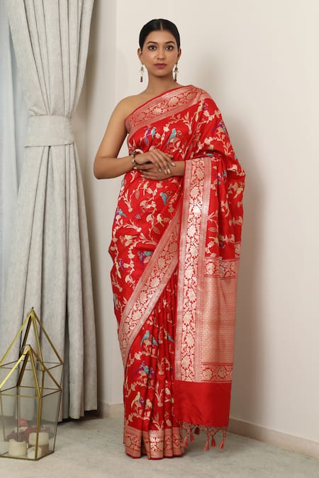 Red banarasi saree featuring zari woven floral vine and parrot patterns