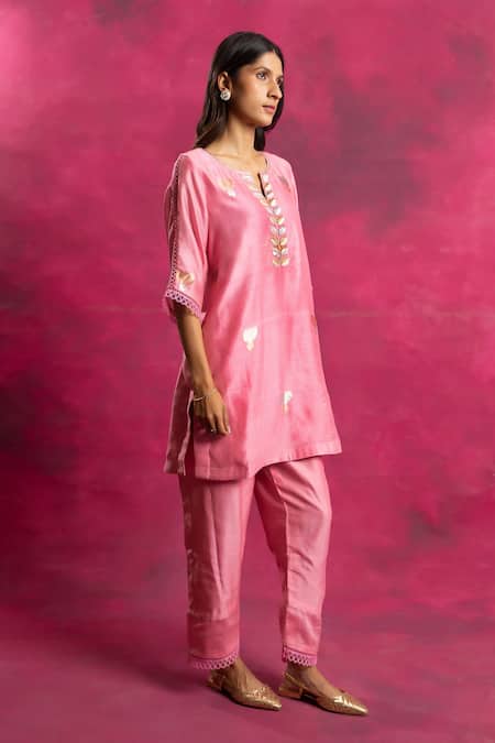 Pink kurta featuring lotus motifs and an embroidered neckline. Paired with a straight pant that has lace detailing at the hem.