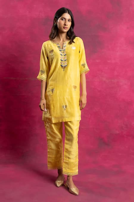 Yellow kurta featuring lotus motifs and an embroidered neckline. Paired with straight pants with lace detailing.