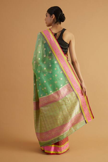 Green saree featuring contrast borders with geometric and floral woven patterns