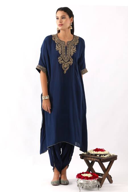 Midnight blue kaftan featuring batwing sleeves and an asymmetric hem. Paired with a dhoti pant embellished with gota lace.