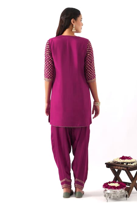 Magenta pink straight kurta featuring three fourth sleeves and a round neckline with intricate ditsy bloom embroidery in dori, sequin, and cutdana details. Paired with an embroidered border salwar and a scalloped organza dupatta adorned with floral booti embroidery.