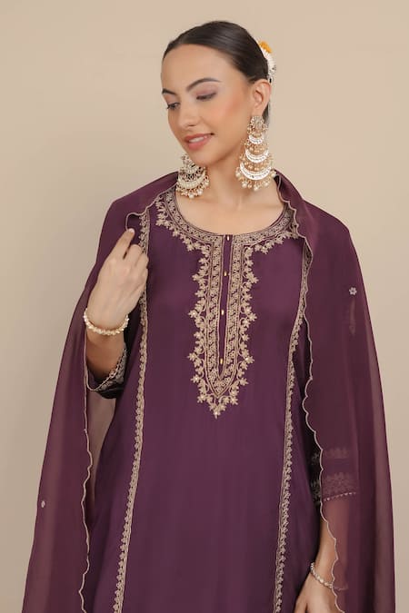 Purple straight kurta featuring dori, cutdana, and sequins embroidery in ethnic floral motifs. Paired with gota lace border dhoti pant and scallop border dupatta.