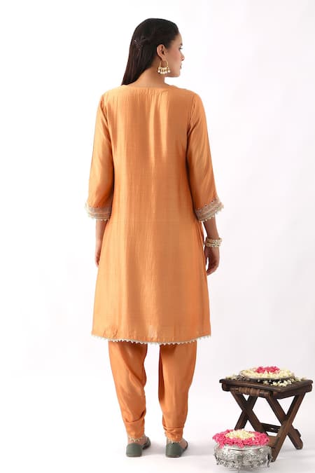 Orange straight kurta featuring floral embroidery with dori and thread. Paired with a dhoti pant and scallop trimmed dupatta.