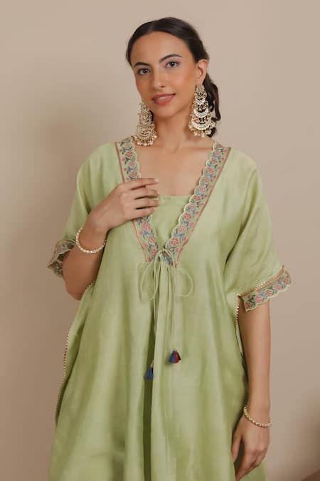 Green Chanderi Silk, Cotton Embroidery V-neck Floral Kaftan With Pant