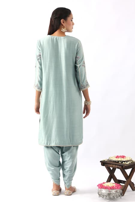 Blue straight kurta featuring scattered floral embroidery with a round neck. Paired with a matching dhoti pant and scallop trimmed dupatta.