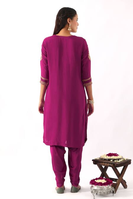 Pink Silk, Modal, Organza Sequins, Cut Work, Magenta Kurta Dhoti Pant Set