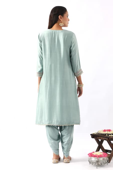 Blue kurta featuring floral embroidery with scallop trim. Paired with a matching dhoti pant and dupatta with flower butti embroidery.