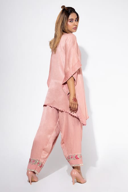 Pink Satin, Modal Mirrors, Embroidery V-neck Kaftan Tunic And Salwar Set