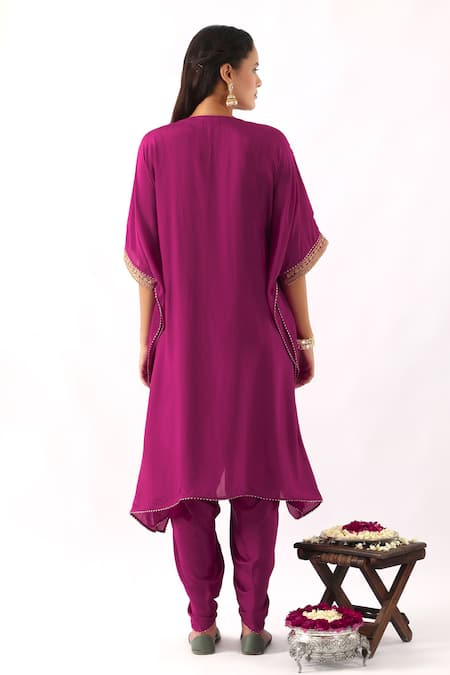 Magenta pink kaftan featuring batwing sleeves and asymmetric hem. Paired with a dhoti pant embellished with trim gota lace.