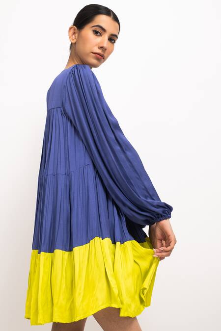 Blue Fringe Round Neck Colorblock Gathered Dress