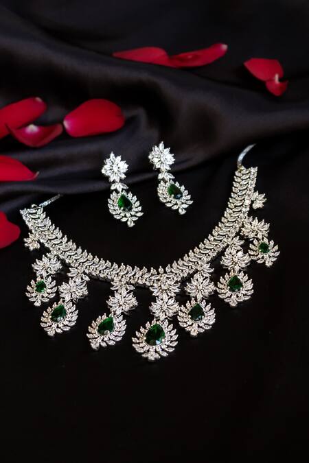 Floral necklace set featuring white rhodium finish with zircon and turquoise emerald stone embellishments. Paired with matching dangler earrings.
