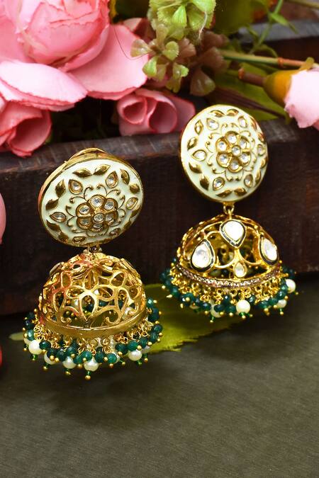 Emerald bead drops enhancing the design, 22ct gold plating for a luxurious finish, Intricate cutwork design on jhumka base