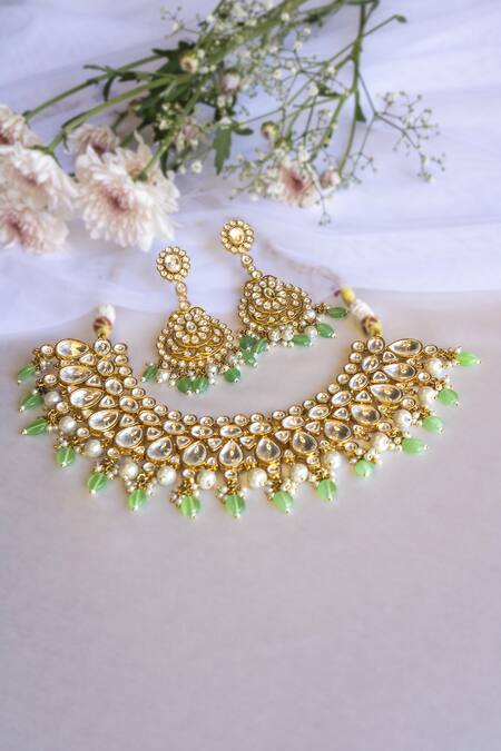 22ct gold plating, Green bead hangings, Kundan and polki embellishments
