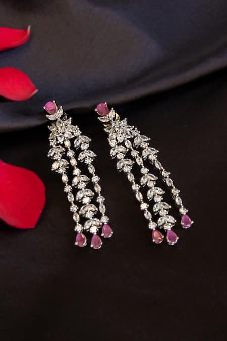 Leaf shaped dangler earrings featuring a white rhodium finish, adorned with zirconia and red ruby stone embellishments