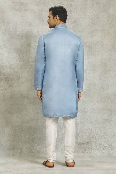 Blue kurta featuring mirror embroidery on the placket, collar, and hem. Paired with a white churidar for a complete look.