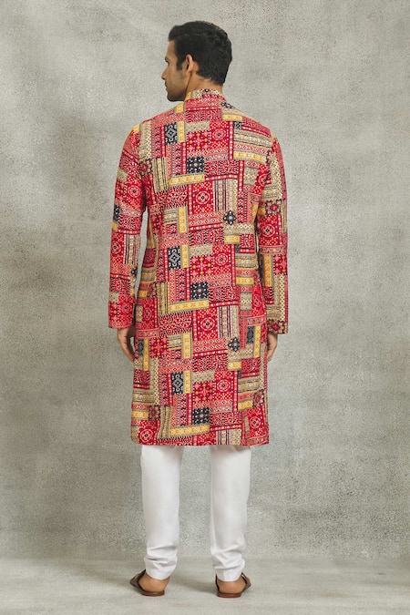 Multicolored ruby silk kurta with block print. Paired with a white churidar.