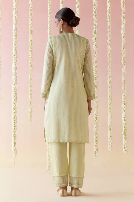Green Chanderi, Crepe Embroidery, Lace, Tassels Aari Stripped Kurta Pant Set