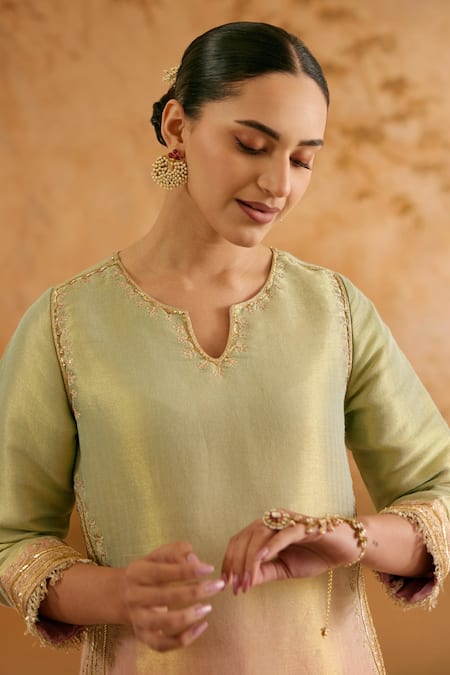 Blush mint kurta featuring a straight cut and intricate embroidery. Paired with a matching sharara made from tissue dobby fabric.