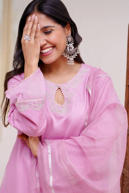 Iris lilac cotton satin kurta featuring a round keyhole neckline with silver zari dori embroidery and rose gold gota lace accents. Paired with wide leg pants adorned with rose gold zari dori embroidered hems and gota lace with organza panels.