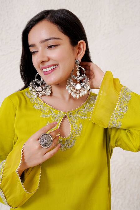 Olive lime green kurta featuring round keyhole neckline, long sleeves, and floral embroidery with gota lace and zari dori details. Paired with wide leg pant adorned with embroidered hem and organza panel accents.