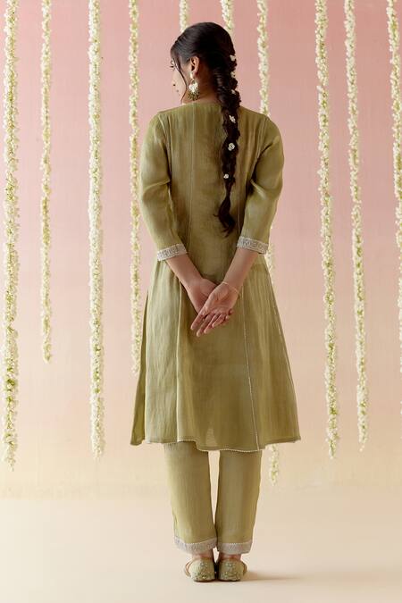 Green Tissue, Satin Embroidery, Tassels Split V-neck Yoke A-line Kurta Pant Set