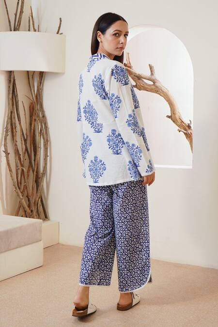 Blue Cotton Embroidery, Lace Floral Buta Hand Block Print Wrap Kurta And Pant Set