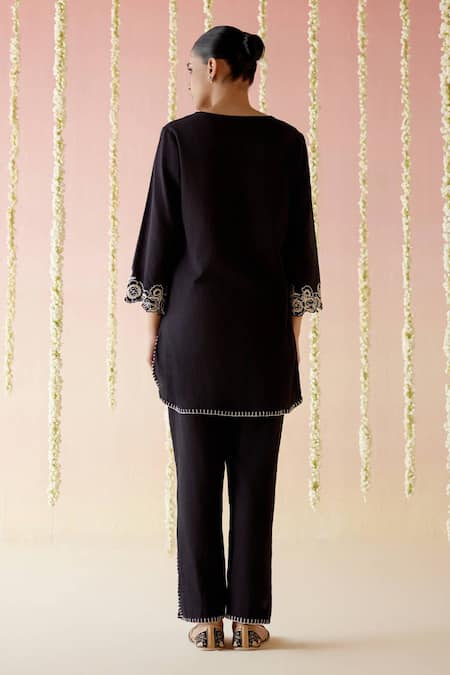 Black tunic featuring floral cutwork embroidered cuffs and a relaxed fit. Paired with matching pants that have a detailed hemline.