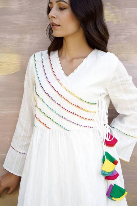 White angarkha style short anarkali featuring gota lace embellishments and side tasseled tie-up details. Paired with a tulip pant featuring colorful detailing along the sides.