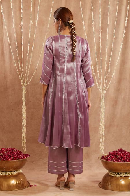 Purple kurta featuring V neck, three-quarter sleeves, and gota lace embellishments. Paired with a matching pant with embellished hem.