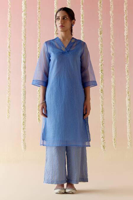 Sapphire blue sheer kurta featuring a V-neck and flared sleeves with floral embroidery. Paired with striped pants and a matching inner slip.