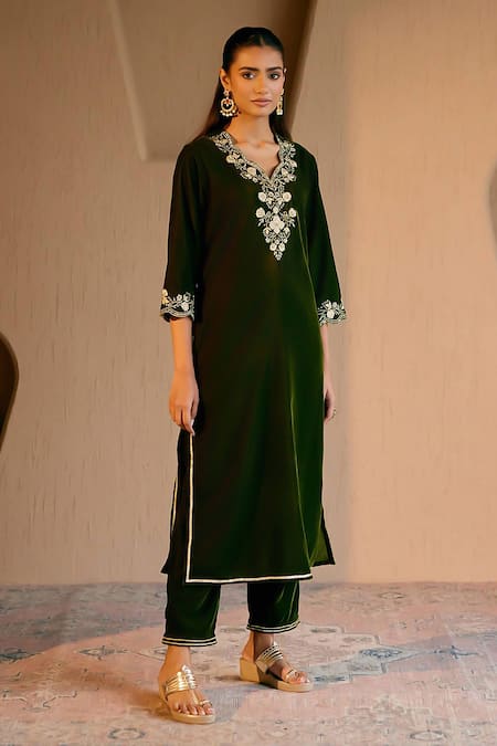 Olive velvet kurta featuring intricate embroidery and a V-neckline. Paired with matching olive pants for a complete look.