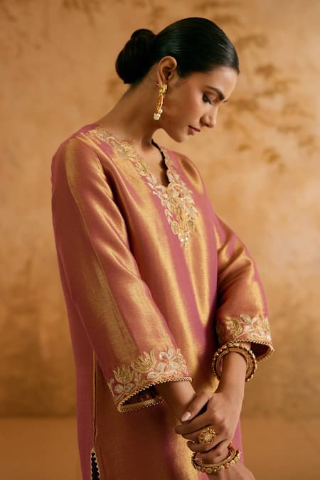 Purple and orange kurta featuring a chevron tissue fabric with intricate embroidery. Paired with matching tissue dobby pants for a complete look.