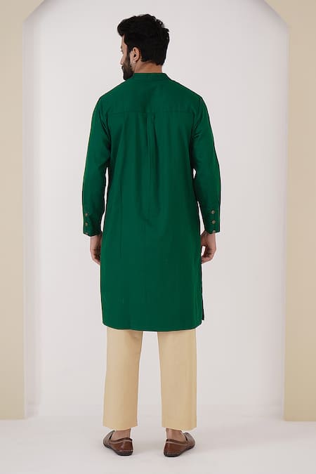 Emerald green cotton satin kurta featuring a band collar, concealed placket, and pintucks. Paired with gold pure cotton narrow pant.