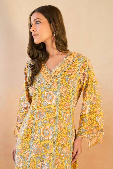 Sunflower yellow kurta featuring a vibrant chintz print and intricate cutwork. Paired with wide leg pants crafted from soft pure cotton for comfort.