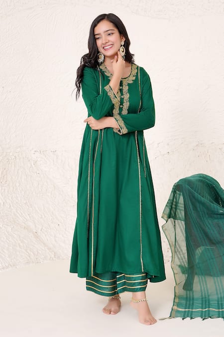 Emerald green kurta featuring floral gota lace and zari dori embroidery. Paired with wide leg pants embellished with gold gota lace work.