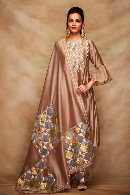 Antique gold chanderi silk dupatta with heavy gota work on hem.