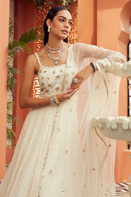 Ivory georgette hand embroidered fitted anarkali. Paired with a dupatta.
