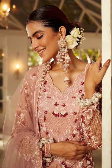 Rose pink floral embroidered fited kurta with scalloped neckline. Paired with gharara & dupatta.