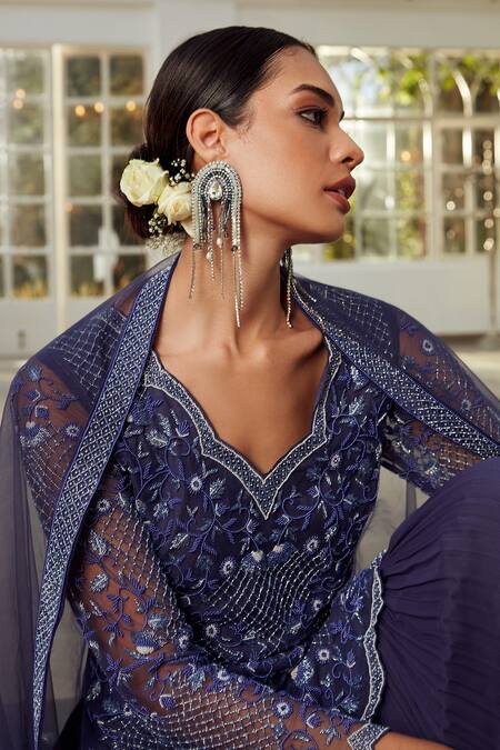 Midnight sapphire blue floral embroidered fitted kurta with scalloped neckline. Paired with gharara & dupatta.