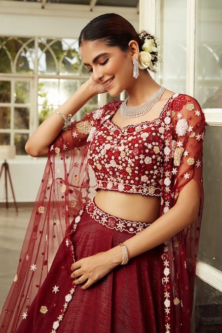 Mahogany red floral embroidered cape wih split sleeves. Comes with embroidered waistband lehenga & fitted embroidered blouse.