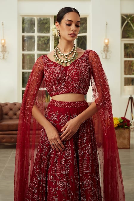 Ruby red floral embroidered lehenga in sequin, pearls & beads work. Comes with a draped sleeve fitted blouse.