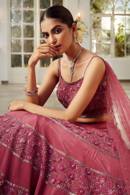 Mauve delicately embroidered lehenga in floral motifs. Comes with embroidered blouse and draped dupatta.