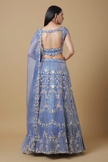 Buy_Niamh By Kriti_Blue Satin , Organza Mirror Work, Embroidered Bridal Lehenga Set _at_Aza_Fashions