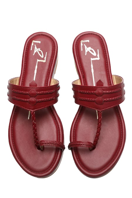 Maroon kolhapuri platform wedges featuring braided detailing and a toe-ring