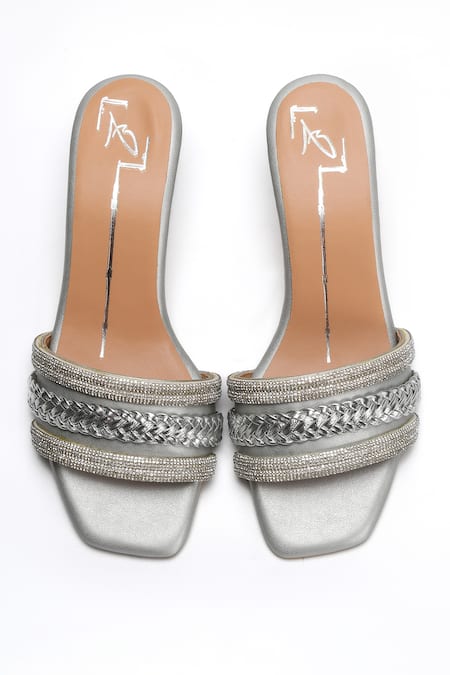 Silver block heels featuring Swarovski embellishments and a braided pattern