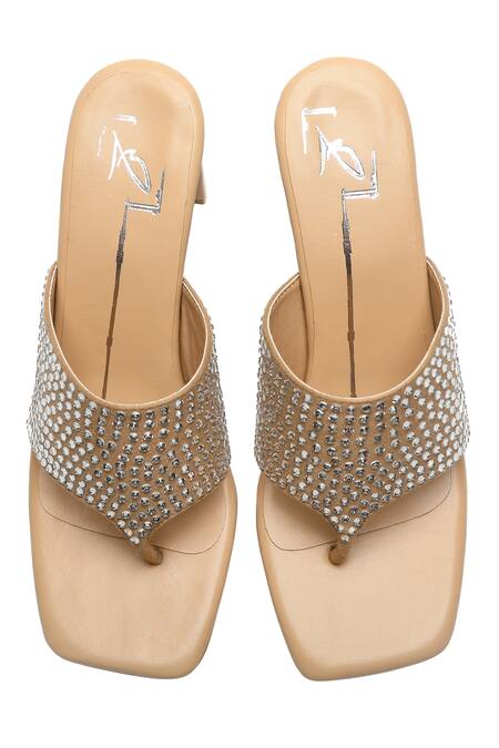 Beige block heels featuring a T-strap front and embellished with Swarovski crystals