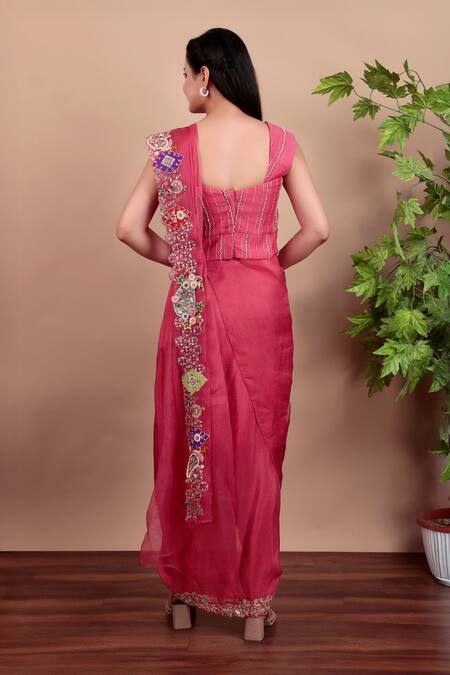 Coral chanderi blouse with intricate embroidery details. Paired with a matching dhoti skirt and dupatta featuring embellished borders.
